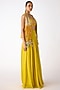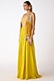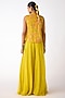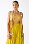 Featuring a yellow jacket in organza base with mirror, shells, thread and brass embroidery. It is paired with a bustier and sharara pants. Accentuate it with kundan polki earrings and heels for festive gatherings or haldi ceremony.