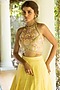 Featuring a yellow halter neck blouse in georgette base with cutdana, thread, and sequins embroidery. It is paired with a matching flared lehenga having cancan and a ruffled dupatta in organza base.