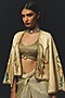 Featuring a beige blazer in linen satin and tissue base. It is paired with a bustier and a satin draped skirt. Style with metallic or nude heels and minimal jewellery for a complete look, perfect for gatherings, cocktail parties, evening events, and intimate celebrations.