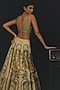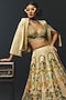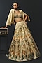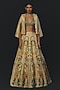 Featuring a beige lehenga in tussar, tissue and linen satin base. It is paired with a blouse, a scarf and an overlay jacket. Style with metallic or pump heels, statement earrings and a leather clutch for a complete look, perfect for cocktail parties, evening events or sangeet celebrations.