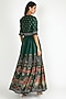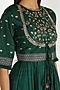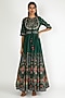 Featuring a bottle green gown in tussar base with zari embroidery and front tie up. It is paired with a matching cut out jacket.