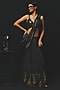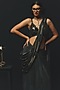 Featuring a charcoal pre-draped saree in gajji satin and chiffon base. It is paired with an embellished blouse. Style with metallic heels, ruby jewellery and a statement clutch for a complete look, perfect for cocktail parties, evening events, sangeet or intimate celebrations.