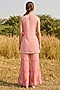 Featuring a peach top in organza base. It is paired with a jacket and pants. Style this set with strappy flats, a cane bag and sunglasses for a vacation or summer outings.