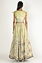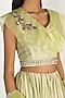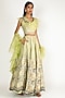 Featuring a sea green lehenga in tussar base with zari hand embroidery and floral print. It is paired with a matching checkered crop top and spiral dupatta in organza base.