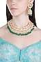 Featuring a 22Kt gold plated necklace studded with pachi kundan and emerald green beads, set in mixed metal. It is paired with a matching pair of earrings.