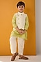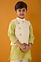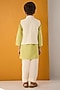 Featuring a cream jacket for boys in cotton silk base with foil dots detailing. It is paired with a green kurta having threadwork and pants. Accentuate it with a pair of mojaris and a watch for a festive occasion, weddings or pooja ceremony.