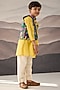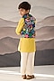 Featuring a multi-colored floral bundi jacket for boys in cotton muslin base with a pocket square. It is paired with a yellow cotton silk kurta and cream pyjama pants having an elasticated waistband. Accentuate it with a pair of mojaris and a watch for a festive occasion, weddings or pooja ceremony.