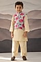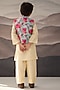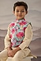 Featuring a multi-colored floral bundi jacket for boys in cotton silk base. It is paired with an ivory kurta and pants having an elasticated waistband. Accentuate it with a pair of mojaris and a watch for a festive occasion, weddings or pooja ceremony.