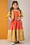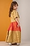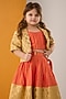 Featuring an orange and gold lehenga for girls in cotton silk and brocade base with an elasticated waistband and latkans detailing. It is paired with a pleated top, a gold brocade jacket and an orange belt. Style it with sandals and a matching hairband for a cute and comfortable festive look, perfect for special occasions or weddings.