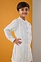 Featuring a powder blue kurta for boys in chanderi base with orange thread work. It is paired with white cotton silk dhoti pants having an elasticated waistband and drawstring detailing. Accentuate it with pair of mojaris and a watch for a festive occasion or pooja ceremony.