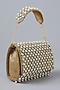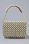 Featuring a golden handcrafted clutch in satin base with embedded pearls and natural stones. It has a satin lining. A timeless piece that will add a touch of refined elegance to festive occasions or wedding ceremonies.