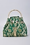 Featuring a green bucket bag in brocade base with a metallic handle. It has a satin lining.