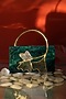 Featuring a green hand-poured clutch in resin base with floral pattern and a metallic handle. It has a suede lining.