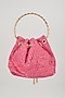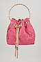 Featuring a pink bucket bag in velvet base with crystal embellishments. It has a nylon lining. A stunning statement piece that elevates any outfit, perfect for weddings, festive functions, sangeet, and elegant evening events.