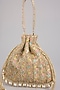 Featuring a gold potli in faux leather and satin base. Carry it with a richly embroidered lehenga and classic heels for a stylish ensemble, ideal for wedding functions, festive celebrations or grand occasions.