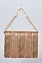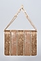 Featuring a gold clutch in vegan leather base with metal lace embellishments. It has a satin lining.