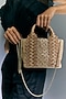 Featuring a golden clutch in faux leather base with metal stud lace. It has a satin lining. Perfect for an elegant and special occasion such as a wedding reception, a sophisticated cocktail party, or a festive celebration.
