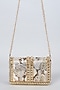 Featuring a green and gold clutch in vegan leather base with metal lace embellishments. It has a satin lining.
