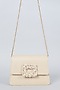 Featuring an ivory clutch in vegan leather base with crystals and pearl embellishments. It has a satin lining and an embellished buckle.