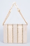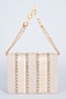 Featuring a silver and gold clutch in vegan leather base with a metal lace. It has a satin lining.