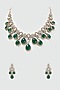 Featuring a two tone finish necklace studded with kundan polki and green beads, set in brass. It is paired with a matching pair of earrings.