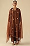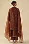 Featuring a copper kurta in banarasi silk base with rose motif hand embroidery. It is paired with a muslin cotton slip, habutai silk pants and an organza dupatta having mukaish and zari embroidery. Style it with statement earrings and embroidered juttis, perfect for daytime festive gatherings or pre-wedding events.