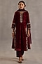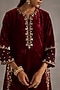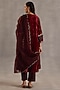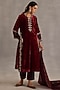 Featuring a garnet kurta in velvet base with gota, moti, sequins, dabka and zardosi embroidery. It is paired with satin tissue pants, a slip and an organza dupatta. Accentuate it with statement earrings and strappy heels for festive gatherings or family functions.
