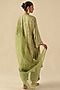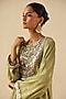 Featuring a green kurta in zari moonga silk base with floral motif and mirror hand embroidery. It is paired with habutai silk pants and an organza dupatta. Style it with statement earrings and embroidered juttis, perfect for daytime festive gatherings, mehendi or pre-wedding events.