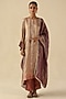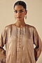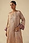 Featuring a rose pink kurta in zari silk tissue base with woven striped gold accents. It is paired with habutai silk pants and a tissue stole. Style it with statement earrings and embroidered juttis, perfect for daytime festive gatherings or pre-wedding events.