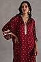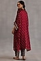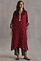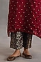 Featuring a ruby red phiran kurta in satin tissue base with gotta patti, dabka and zari embroidery, including a V-neckline. It is paired with brocade silk pants and an upada silk slip. Accentuate it with statement earrings and strappy heels for festive gatherings or family functions.
