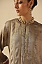 Featuring a silver kurta in zari silk tissue base with woven striped gold accents. It is paired with habutai silk pants and a tissue stole. Style it with statement earrings and embroidered juttis, perfect for daytime festive gatherings or pre-wedding events.