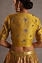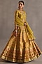 Featuring a yellow lehenga in ikat silk base. It is paired with a raw silk blouse having nakshi, dabka and gota patti hand embroidery, including an organza dupatta. Accentuate it with statement earrings and strappy heels for haldi or wedding ceremonies.