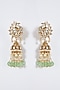 Featuring a pair of gold finish peacock jhumka earrings studded with kundan and pearls, set in mixed metal.