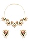 Featuring a gold finish green and pink enamled necklace studded with kundans and pearls, set in brass metal. It is paired with a matching pair of earrings.