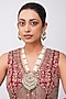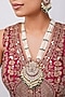 Featuring a gold finish rani-haar necklace studded with kundan polki, ruby and emerald stones, set in copper. It is paired with a matching pair of earrings. Perfect for weddings, festive events and grand celebrations, this exclusive necklace set is a symbol of opulence and refined style.