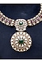 Featuring a gold finish necklace studded with kundan polki, ruby and mint stones, set in copper. It is paired with a matching pair of earrings. Add a touch of sparkle to your ensemble, perfect for wedding functions, festive occasions, or parties.