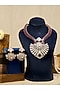 Featuring a gold finish necklace studded with kundan polki, ruby and mint stones, set in copper. It is paired with a matching pair of earrings. Add a touch of sparkle to your ensemble, perfect for wedding functions, festive occasions, or parties.