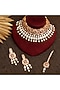 Featuring a gold finish choker necklace studded with multi-colored kundan polki, set in copper. It is paired with a matching pair of earrings and maangtikka. Add a touch of sparkle to your ensemble, perfect for wedding ceremonies or festive celebrations.