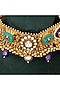 Featuring a gold finish choker necklace studded with multi-colored stones and kundan polki, set in copper. It is paired with a matching pair of earrings. Add a touch of sparkle to your ensemble, perfect for wedding ceremonies or festive celebrations.