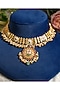 Featuring a gold finish choker necklace studded with pacchi kundan polki and semi-precious pearls, set in copper. It is paired with a matching pair of earrings. Lightweight yet striking, this versatile design pairs effortlessly with any ethnic or festive fusion outfits, making it perfect for weddings, festive occasions and bridal celebrations.