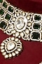 Featuring a 18kt gold plated choker necklace studded with kundan polki, set in copper. It is paired with a matching pair of earrings and a maangtikka. Style this jewellery with any traditional wear to elevate your ensemble with a regal touch and enhance its richness. Perfect for weddings, festive celebrations and grand evening functions.