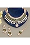 Featuring a 18kt gold plated necklace studded with kundan polki, emerald and pearls, set in copper. It is paired with a matching pair of earrings and a maangtikka. Add a touch of sparkle to your ensemble, perfect for wedding ceremonies or festive celebrations.