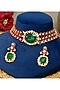 Featuring a 18kt gold plated choker necklace studded with kundan polki, emerald and ruby stones, set in copper. It is paired with a matching pair of earrings. Style this jewellery with any traditional wear to elevate your ensemble with a regal touch and enhance its richness. Perfect for weddings, festive celebrations and grand evening functions.