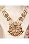 Featuring a 18kt gold plated necklace studded with kundan polki and multi-colored stones, set in copper. It is paired with a matching pair of earrings. Add a touch of sparkle to your ensemble, perfect for wedding ceremonies, special occasions or festive celebrations.