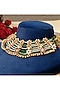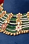 Featuring a matte gold finish layered necklace studded with kundan polki, pearls and emerald stones, set in copper. It is paired with a matching pair of earrings. Style this jewellery with any traditional wear to elevate your ensemble with a regal touch and enhance its richness. Perfect for weddings, festive celebrations and grand evening functions.