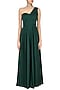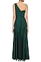 Featuring an emerald green one shoulder drape gown in imported satin base with flared ghera.