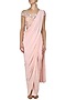 This set features a blush three piece saree with a pre-stitched jersey drape paired with matching cigarette pants and an off shoulder net blouse with sequins, florets, beads and crystals floral on the front and back.