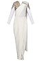 Featuring an ivory crop top in georgette base with gold geometric beading. It is paired with lace drape saree with cigarette pants.