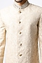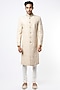 Featuring a resene white sherwani in raw silk base with a self embroidery and zardosi collar. It is paired with contrasting off-white cotton silk churidar pants.