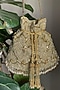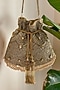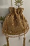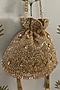Featuring a gold potli in velvet base with sequins, beads and stones hand embroidery, including rope drawstrings. It has a suedette lining and a metal handle. This potli is perfect for a festive occasion, engagement or wedding ceremony.